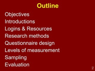 The document outlines the objectives and content of a survey design workshop. It discusses key topics like questionnaire design, levels of measurement, sampling, and implementation issues. The workshop aims to help participants understand rigorous survey planning, common survey methods, questionnaire design best practices, and critically reviewing example surveys.