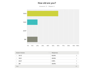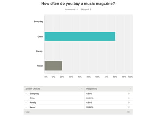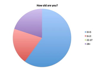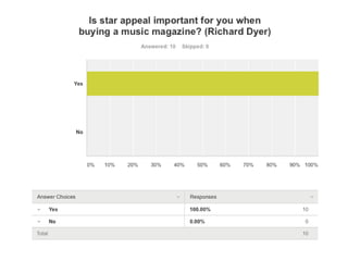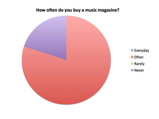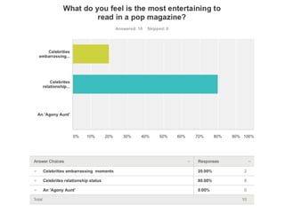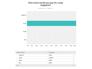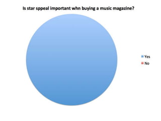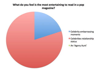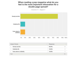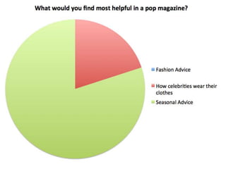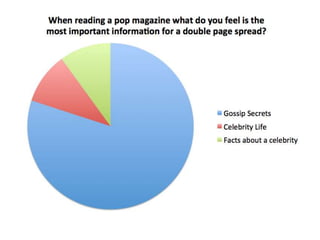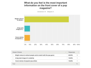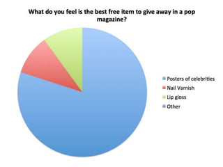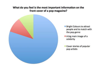 The survey results showed that including pictures of celebrities, bright colors like pink and purple, gossip and secrets, and posters of celebrities would attract young teenage readers to a music magazine. Respondents also indicated the magazine should cost between £1-£2 and include celebrities' relationship statuses and seasonal advice. The surveys helped inform what topics and design elements would appeal most to the target audience for the new magazine.