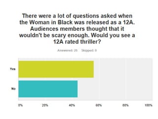 The author created a survey through Survey Monkey and distributed it to Facebook friends of various ages to understand audience expectations for different film genres and ages. Results from 30 respondents showed that thrillers were most popular with certain genders and ages, and most expected a thriller to have a 15 rating. While horror was also popular, the filmmakers decided on a psychological thriller set in a house with both modern and classic elements to appeal to younger and older viewers, promoting it with both a poster and trailer.