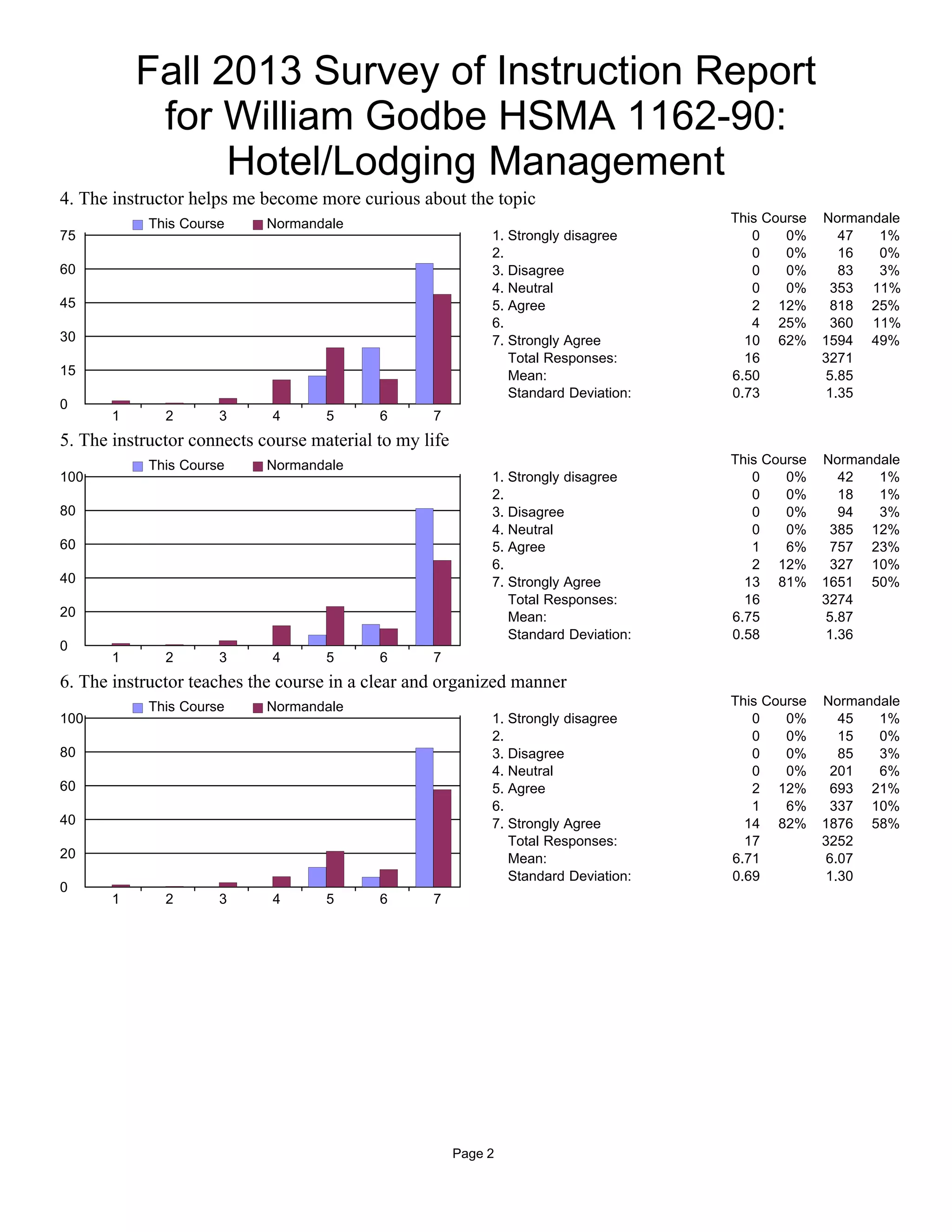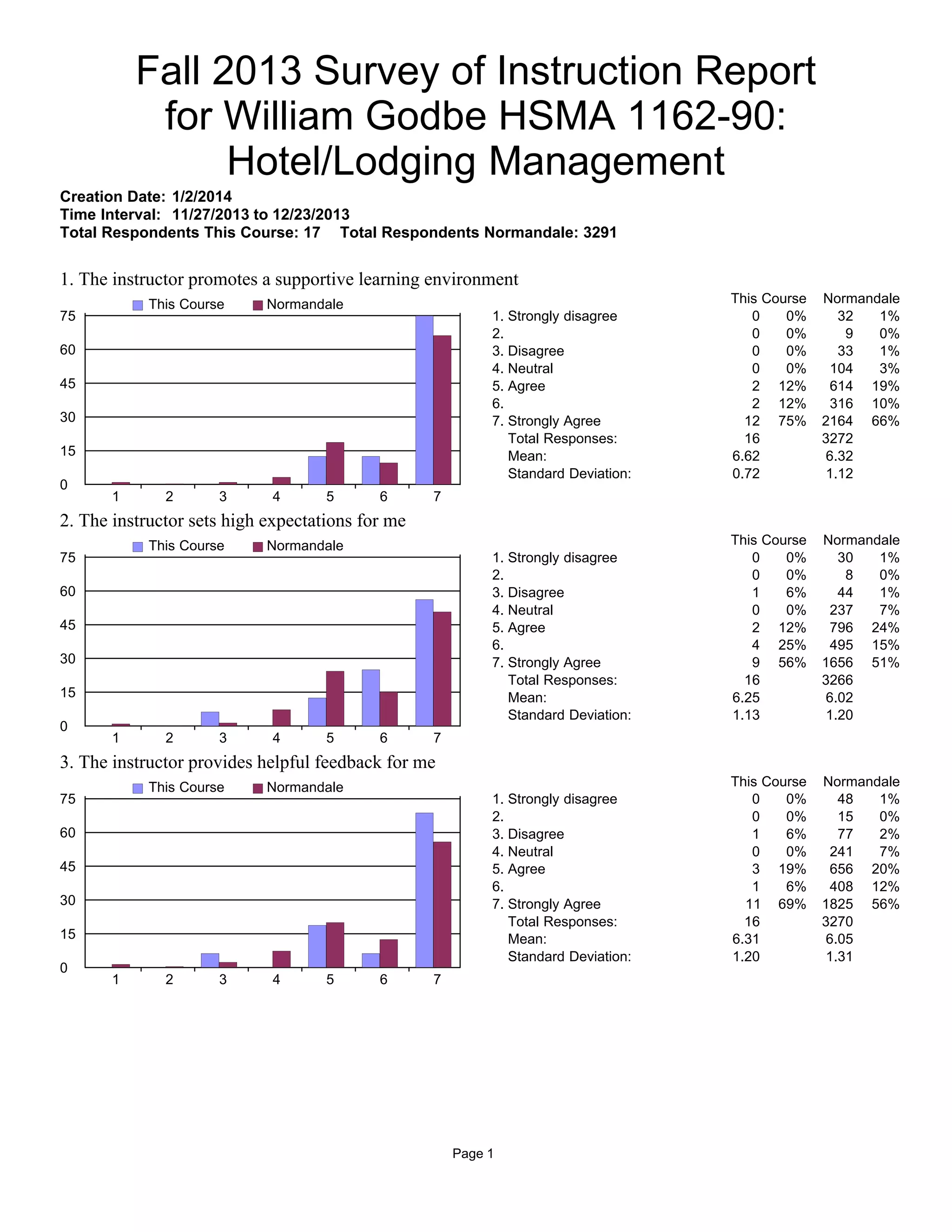 The survey report summarizes student feedback for a Hotel/Lodging Management course taught by William Godbe at Normandale Community College in fall 2013. Across 10 metrics measuring various aspects of instruction, an overwhelming majority (75% or higher) of the 17 students in the class strongly agreed that the instructor promoted a supportive learning environment, set high expectations, provided helpful feedback, helped increase curiosity about the topic, connected course material to students' lives, taught clearly and organized, presented material engagingly, demonstrated strong subject matter knowledge, and that students would recommend both the course and instructor to others. Student responses for the class were consistently higher than the average for all Normandale courses.