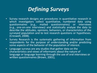 Survey research involves systematically collecting quantitative data using questionnaires or interviews to describe populations and test hypotheses. This document discusses survey goals, types of information collected, key characteristics, and considerations for designing valid and reliable surveys. It describes common survey types like cross-sectional and longitudinal, sampling methods, administration approaches, and data analysis techniques. Guidelines are provided for writing clear questions and designing effective questionnaires.