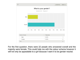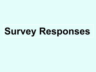 This document summarizes the responses to a survey about music video preferences. Some key findings include: most respondents were female; realistic footage was preferred over unrealistic; a storyline was the most important feature; non-diegetic sounds are less common in indie videos; YouTube is the primary way people access music videos; favorite artist videos often have storylines; indie-related artists were commonly cited as favorites; opinions were mixed on including the actual artist in the video; and black and white was the most popular color scheme but other options were also popular. The survey responses will help inform decisions about the genre, style, and features included in the respondent's upcoming music video.