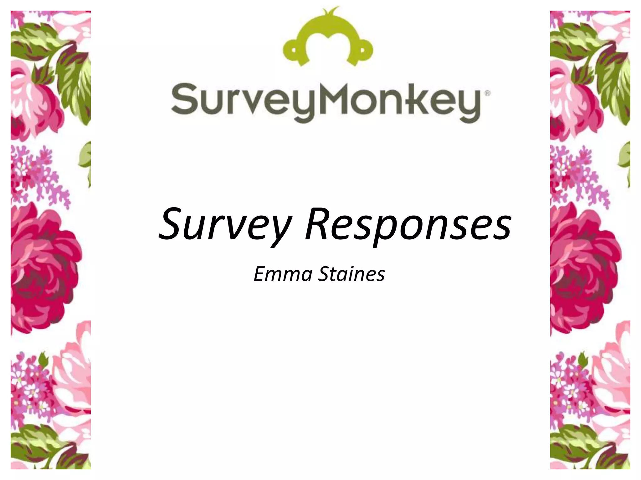 The survey responses provided feedback on Emma Staines' proposed music magazine. While most respondents were female and under 17, the magazine aims for an audience of 16-28 year olds. Over half said they would purchase the magazine monthly. Respondents preferred magazines with dominant images over text, and layouts were considered key. Popular features included images, interviews, and charts. The suggested price range was £2-4. Most wanted an online and social media presence for the magazine.