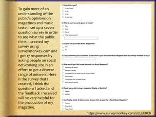 The document discusses a survey conducted to understand public opinions on magazines and music tastes. It describes the 7 questions asked in the survey distributed through social media. The results showed that most respondents were in the target 14-20 age range and preferred rock music. Respondents indicated a preference for music magazine interviews and weekly versus monthly issues. The top masthead name choice from respondents matched the author's selection. The survey provided useful feedback for the production of the author's planned rock music magazine.
