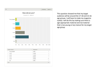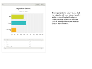 The document summarizes the results of a survey conducted to determine key aspects of designing a school magazine. The survey showed that the magazine should: have mostly female content and colors; target ages 15-18; focus on gossip, events, and sports; cost between £1-£1.99; publish weekly; be named "Inside Ilsley"; use blue, purple and red colors; and include 4-6 pages with articles about friends and after school clubs.