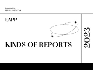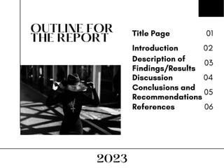 The document discusses different types of reports and outlines for reports. It provides examples of report outlines that include a title page, introduction, description of findings/results, conclusions and recommendations, and references.