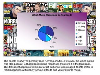 The majority of survey respondents read Kerrang or NME magazines and listen to rock or indie music. Most spend £5 or less per month on music magazines and value reasonably priced options. A large portion attend gigs or festivals and look for information about upcoming events in magazines. Pictures of favorite bands and exclusive interviews are most attractive on magazine covers according to the survey results.
