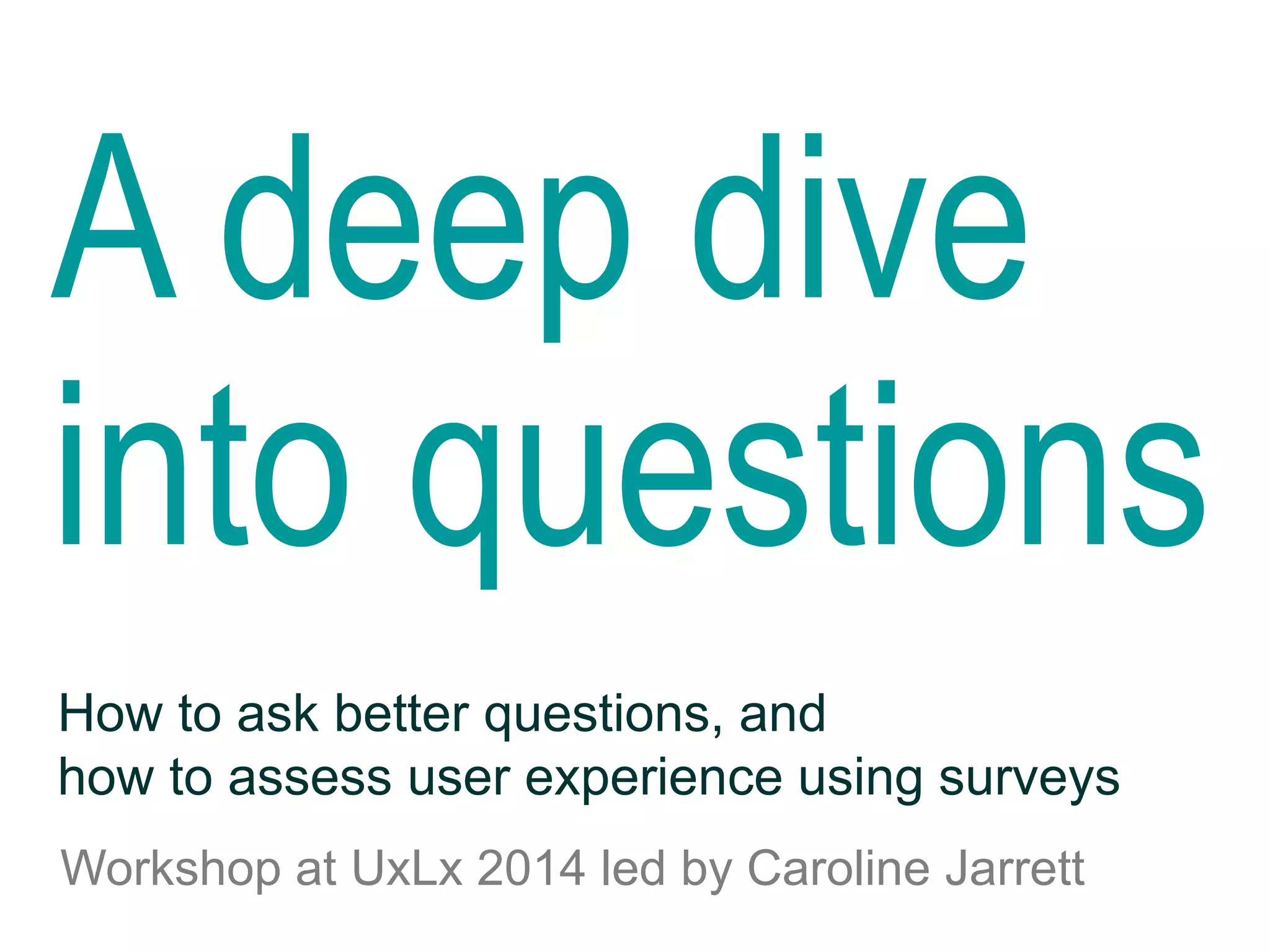 The document outlines a workshop led by Caroline Jarrett on improving question-asking skills and user experience assessment through surveys. It details a structured approach to crafting effective survey questions, including steps such as reading, finding, judging, and placing answers, alongside emphasizing the importance of user trust and engagement. The workshop also covers practical tips for assessing user experience and designing better surveys to gather meaningful feedback.