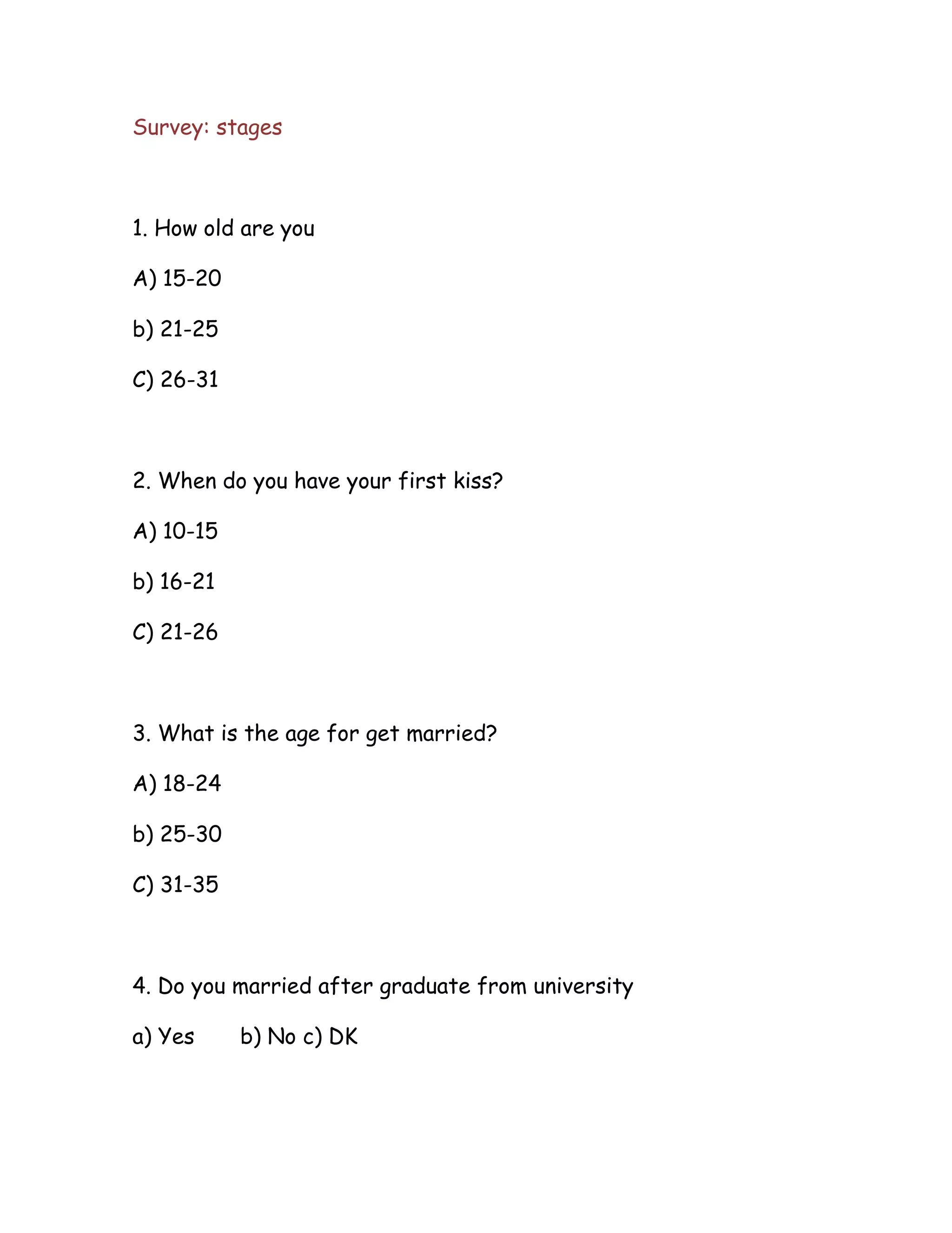 The document describes the results of a survey about life stages. The survey asked 10 multiple choice questions about topics like age of first kiss, appropriate age for marriage and children, and opinions on teenage driving and marriage. It then provides the percentage results for each multiple choice answer across the 10 questions, with most respondents falling into the expected mainstream choices for each issue.
