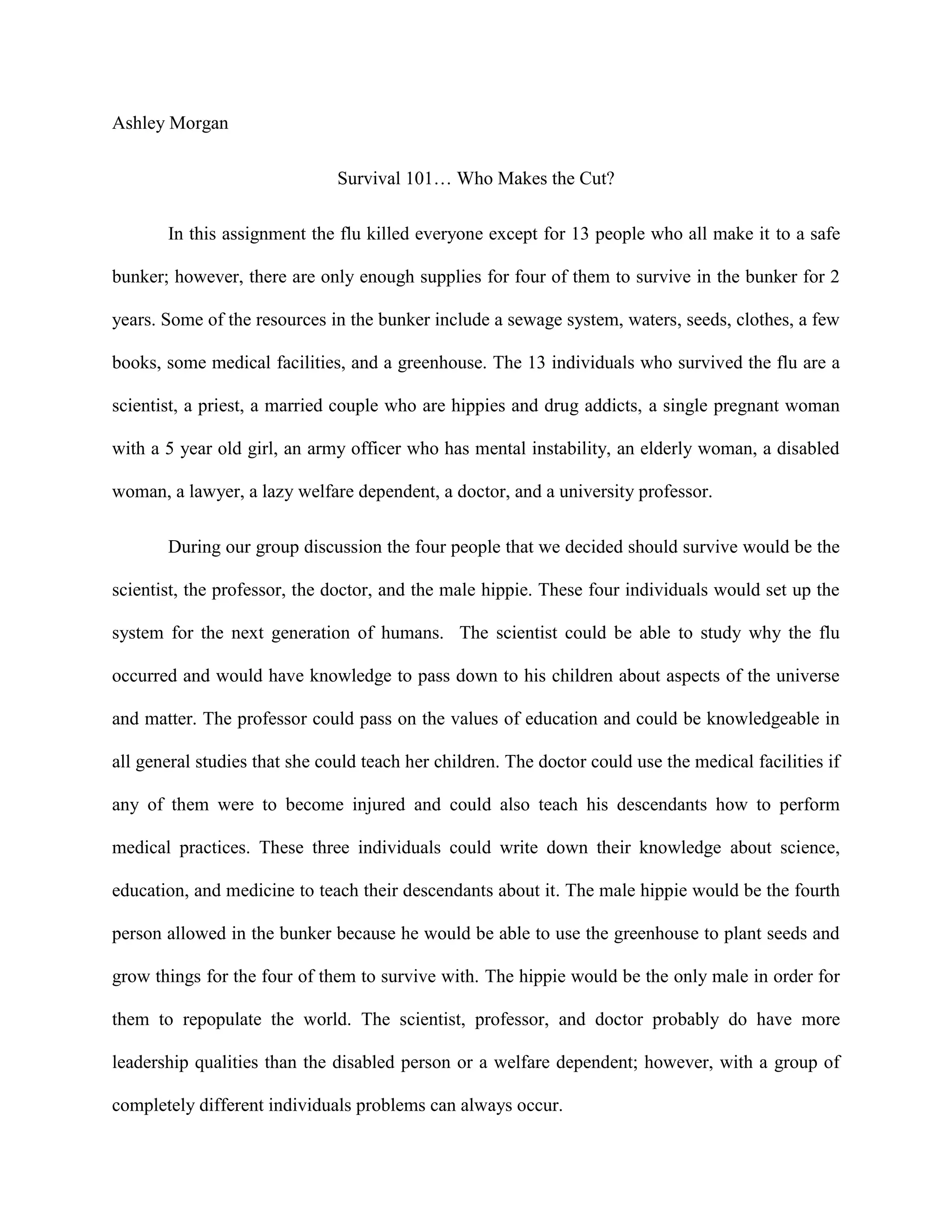 The document discusses 13 people who survived a deadly flu outbreak and made it to an underground bunker with limited resources for 4 people to survive for 2 years. The group consisted of a scientist, priest, married hippie couple, pregnant woman and child, unstable army officer, elderly woman, disabled woman, lawyer, welfare dependent, doctor, and professor. The summarizer's group chose the scientist, professor, doctor, and male hippie to survive as they could pass on knowledge of science, education, medicine, and the hippie could grow food in the greenhouse to sustain the group long-term.