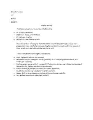 The document outlines a survival scenario and lists the roles chosen and exempted. It was chosen that the group consist of a biologist scientist, doctor who can deliver babies, English professor, and police officer to avoid being alone. These roles were selected as they have the best abilities to survive, make progress, communicate well, and make use of available resources. Exempted from the group were a priest, hippie drug-addict couple, single mother with young child, elderly woman, disabled person, lawyer, and lazy dependent as their roles were deemed not essential for survival or reproduction.