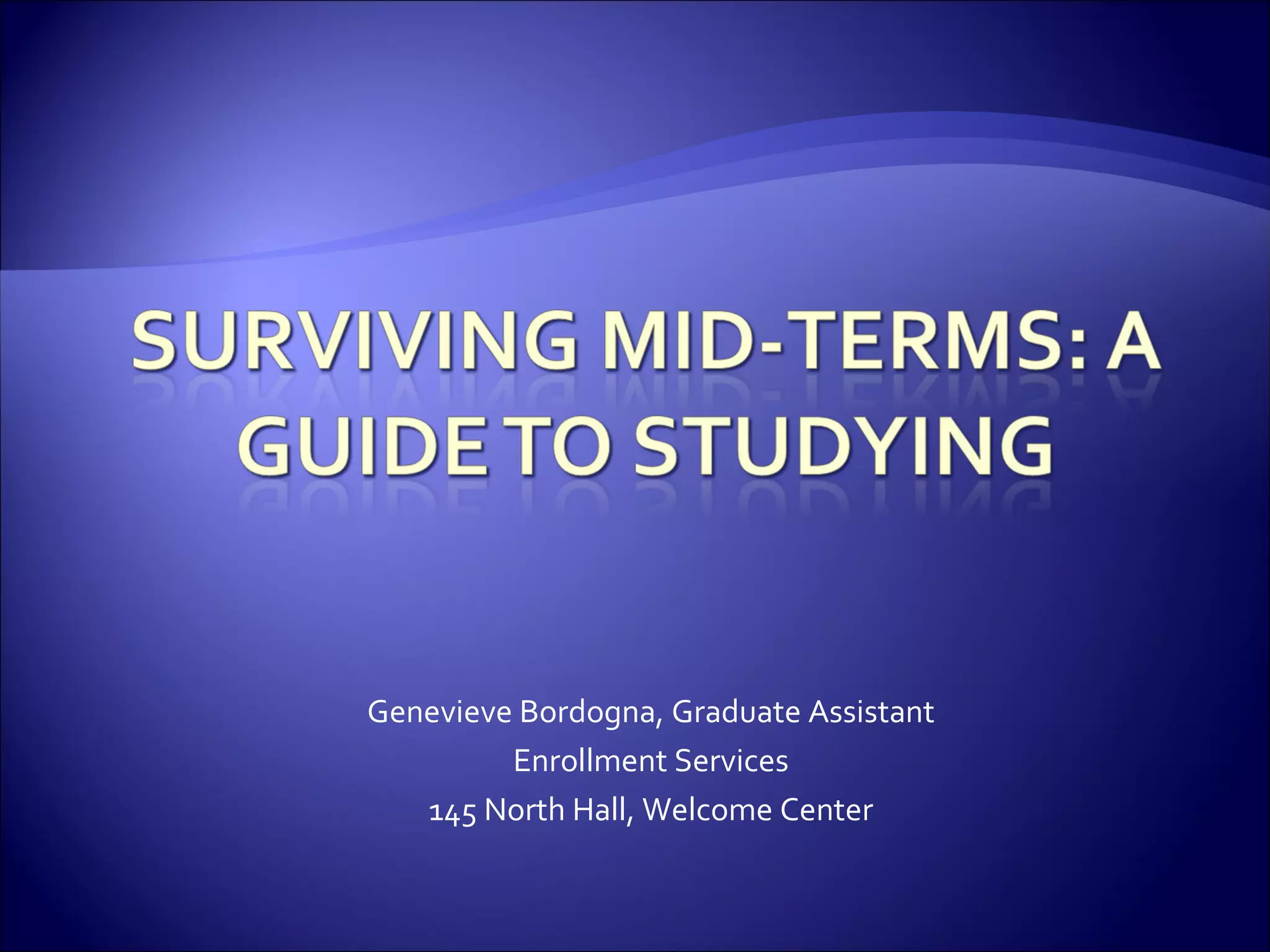 The document provides tips and strategies for college students to be successful in their courses. It discusses developing a positive attitude and healthy self-esteem. Students are encouraged to review material regularly using different techniques like questioning, reciting, and making flashcards. The document also provides advice on managing test anxiety, creating effective study plans, finding a good study space, working with study groups, and seeking tutoring resources on campus.