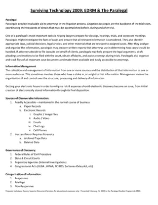 The document discusses the crucial role of litigation paralegals in managing case details, assisting attorneys in trial preparation, and overseeing the organization of legal information. It highlights the importance of electronic discovery (e-discovery), detailing processes such as identification, preservation, collection, and review of electronically stored information (ESI). Additionally, it emphasizes technology's impact on improving the efficiency of document search and retrieval, and outlines guidelines for compliance in the discovery process.