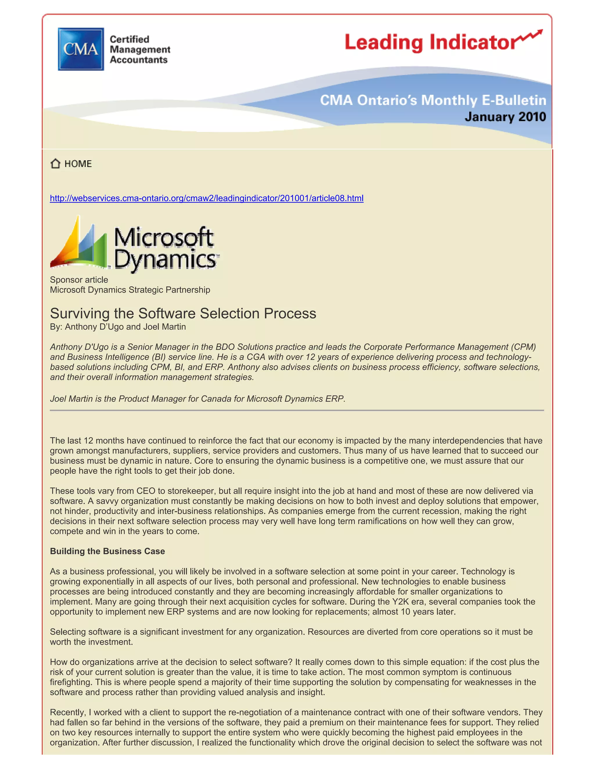 The article by Anthony D'Ugo and Joel Martin emphasizes the importance of a strategic approach to software selection in organizations, particularly as they emerge from economic downturns. It outlines the decision-making process for replacing or upgrading software, highlighting the need for proper evaluation frameworks and criteria, as well as the significance of involving leadership and cross-functional teams throughout the process. Additionally, it discusses post-selection activities, including hiring consultants and defining implementation roadmaps to ensure successful software integration.