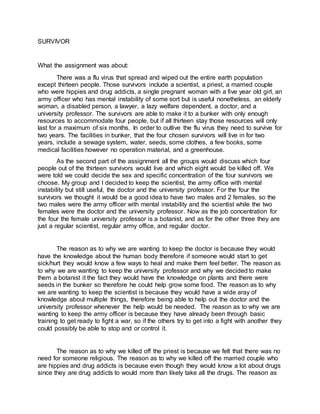 The document describes a scenario where a flu virus has wiped out the global population except for 13 survivors who have taken shelter in an underground bunker. However, the bunker's resources are only enough to sustain 4 people for the 2 years needed to outlive the virus. The group decided to keep the scientist, army officer, doctor, and a botanist professor to make use of their skills. The scientist and army officer are male, while the doctor and botanist professor are female. The other 8 survivors - including a priest, addicted couple, pregnant woman, elderly woman, disabled person, lawyer, and welfare dependent - were deemed less useful and would be killed off.