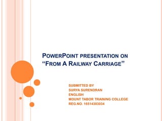 This PowerPoint presentation summarizes the poem "From a Railway Carriage" by Robert Louis Stevenson. It discusses how the poem describes the speed of a passing train as faster than fairies and witches, charging through bridges, houses, hedges and ditches like troops rushing into battle. The first stanza compares the journey by train to soldiers rushing across meadows where horses and cattle graze, conveying the great speed. The presentation then states it will analyze some of the images from the poem.