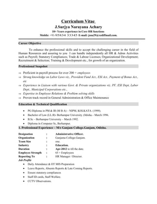 J.Surjya Narayana Achary has over 10 years of experience in core HR functions such as payroll, statutory compliances, recruitment and selection, and training and development. He is proficient in payroll for over 200 employees and has strong knowledge of Indian labor laws. Achary holds a PG Diploma in PM & IR, an LL.B, and a B.Sc and has worked in HR roles for various organizations in industries including education, logistics, manufacturing, and shipping.