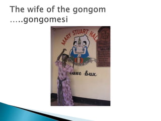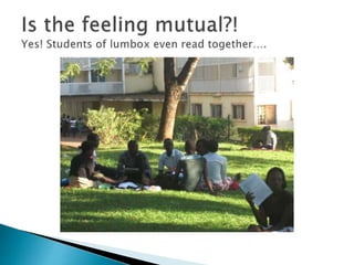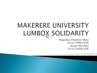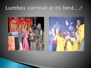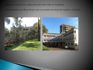 Lumumba Hall has been home to elephants since 1971, where boys refer to themselves as elephants and pay tribute to the hall's gongom symbol which has a protection brigade of 10 members. The document discusses Lumumba Hall traditions including lumbox solidarity activities like a porridge party and carnival where entertainers performed and boys enjoyed interacting, before ending with students eating, drinking and merrymaking.