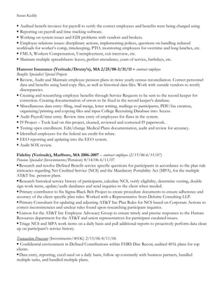 Susan Keddy has over 15 years of experience in human resources and administrative roles. She has extensive experience processing payroll, benefits, new hires, and terminations using various systems like ADP, Winteam, and AS400. She also manages employee relations functions such as FMLA, workers' compensation, unemployment claims, and disciplinary actions. Keddy maintains spreadsheets to track metrics like leaves of absence, perfect attendance, and years of service. She previously worked as a pension specialist where she researched service histories and calculated pension benefits for AT&T plans.