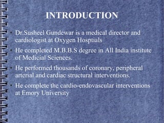 Dr. Susheel Gundewar is a cardiologist and medical director at Oxygen Hospitals who completed his MBBS degree from AIIMS and cardio-endovascular training at Emory University. He has performed thousands of coronary, peripheral arterial, and cardiac structural interventions such as angioplasty for coronary artery disease and peripheral artery disease, which are less invasive than bypass surgery. Dr. Gundewar is available for consultations between 8am-1pm at Oxygen Hospitals in Vikrampuri and 1pm-5pm at Oxygen Hospitals in Alwal from Monday to Saturday.