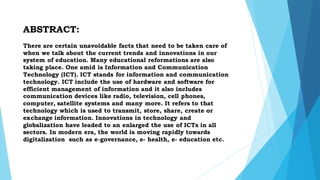 This presentation discusses the importance of information and communication technology (ICT) in the teaching and learning process. ICT refers to technologies that allow users to access, store, transmit, and manipulate information, including hardware, software, and digital content. The presentation outlines how ICT can improve access to remote learning resources, transform learning environments into learner-centered models, and motivate learning anywhere and anytime. While high costs and overuse of technology can present disadvantages, the presentation concludes that ICT plays a significant role in improving education standards and that its implementation has a positive impact on teaching and learning.