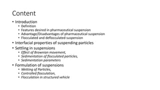 This document presents an in-depth overview of pharmaceutical suspensions, detailing definitions, desired features, formulation methods, and applications. It discusses the differences between flocculated and deflocculated suspensions, sedimentation principles, and the impact of interfacial properties on stability and performance. Furthermore, it covers techniques for improving wetting and controlled flocculation, while also addressing the effects of temperature, electrolytes, and polymers on the physical stability of suspensions.