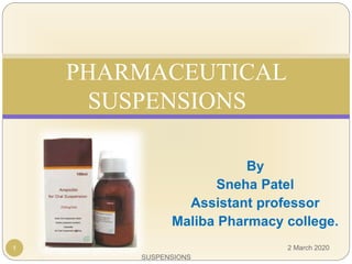 The document discusses pharmaceutical suspensions. It defines a suspension as a coarse dispersion where an insoluble solid drug is uniformly dispersed throughout a liquid medium. Suspensions offer advantages like increased drug stability and controlled drug release. Key considerations in developing suspensions include particle size, sedimentation, wettability, and Brownian motion. Common applications are oral suspensions to mask bitter tastes or for poorly soluble drugs. The document outlines classification, evaluation, stabilization, and manufacturing of pharmaceutical suspensions.