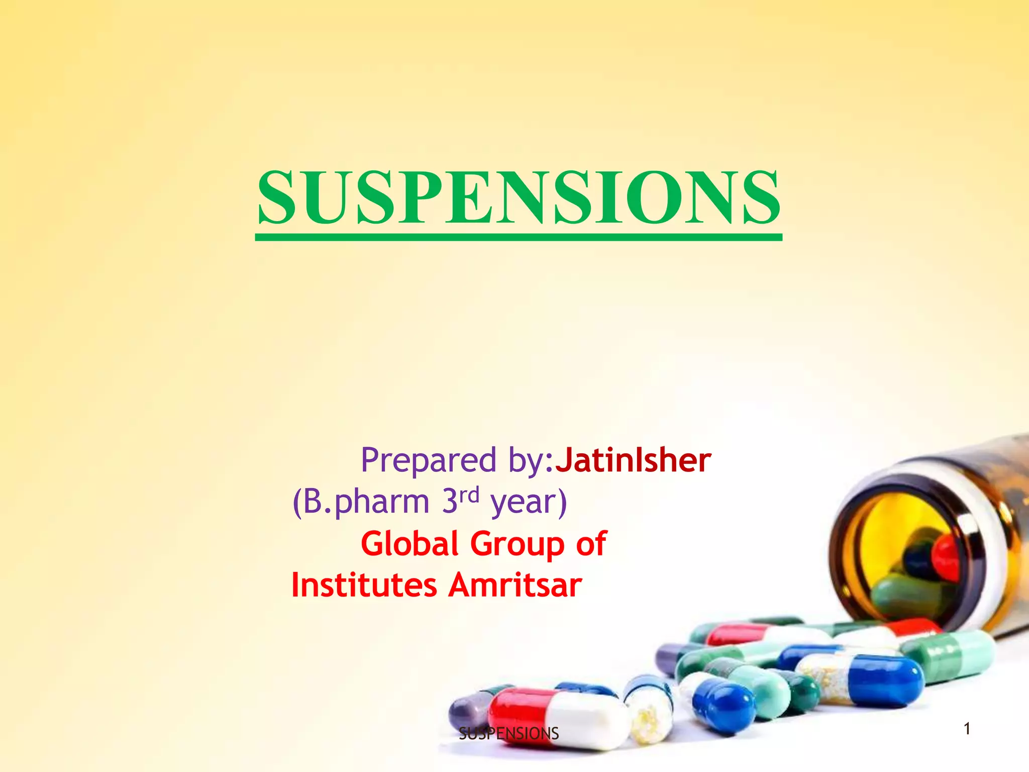 This document discusses pharmaceutical suspensions. A suspension is a coarse dispersion where an insoluble solid drug is dispersed throughout a liquid medium. Suspensions are formulated when drugs are insoluble, to mask bitter taste, increase stability, or allow controlled drug release. Common types include oral, topical, and injectable suspensions. Key factors in suspension quality include particle size, stability, redispersibility, and uniform dosing. Evaluation methods examine sedimentation, viscosity, zeta potential, particle size distribution, and response to freeze-thaw cycles. Proper formulation involves selection of suspending agents, preservatives, buffers, and packaging in containers allowing for redispersion.