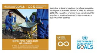 The document discusses the urgent need for sustainable resource use as global consumption exceeds the planet's capacity, predicting a population growth that could require resources equivalent to three planets by 2050. It outlines various thematic areas, including sustainable agriculture, eco-friendly consumer choices, and the importance of sustainable fashion, all aiming to integrate the UN's Sustainable Development Goals. Additionally, it highlights the challenges and necessary actions such as developing capacities, increasing public awareness, and establishing partnerships to achieve these sustainability targets.
