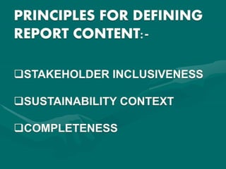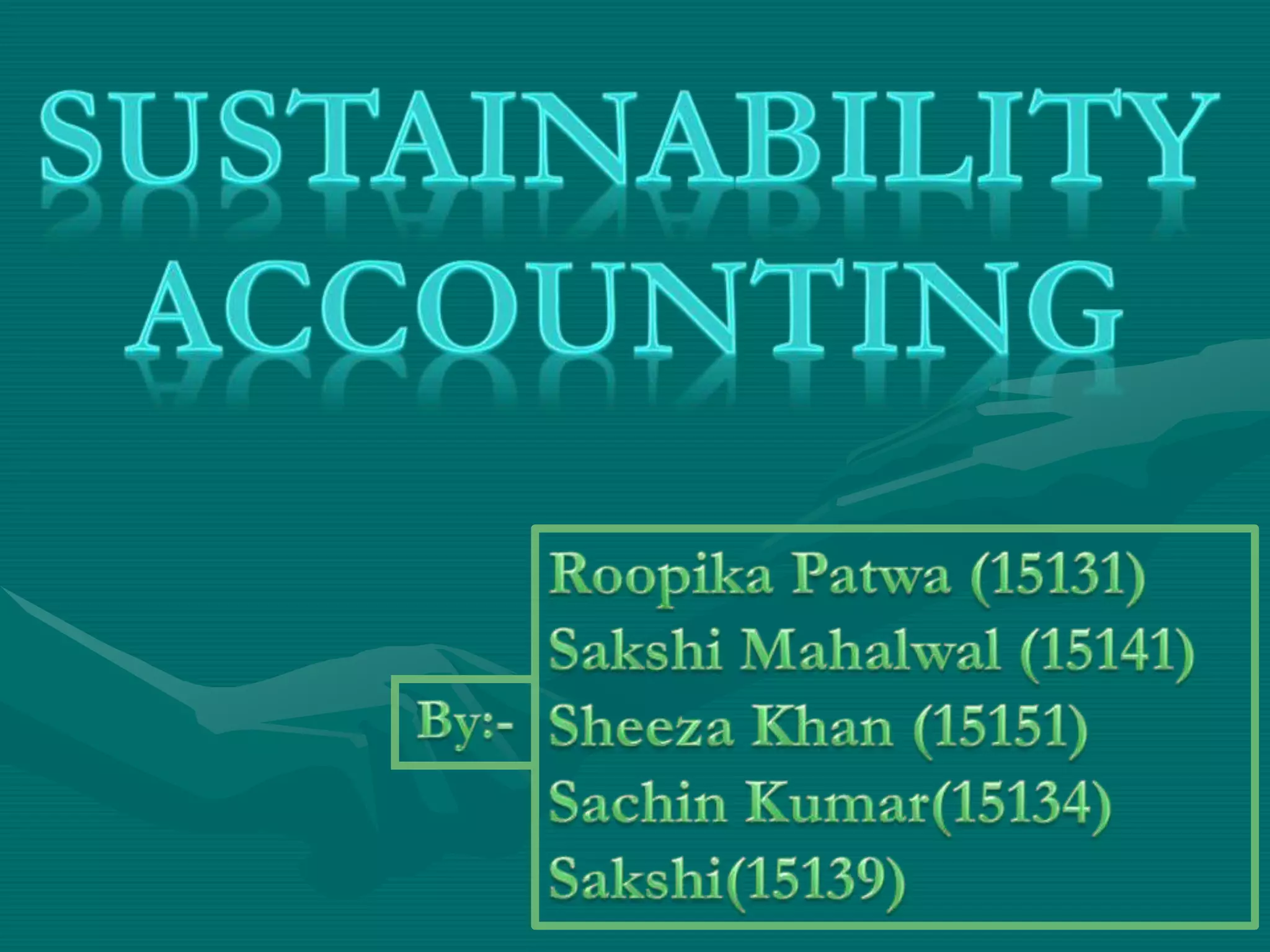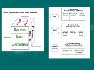 This document discusses sustainability accounting, which accounts for social, environmental, and economic impacts of decision making. It focuses on non-financial reporting and the triple bottom line of people, planet, profit. Sustainability accounting measures performance in these areas, evaluates companies' environmental/social/governance performance, and complements traditional financial accounting. It identifies risks/benefits and encourages stakeholder partnerships. Techniques include shadow pricing, life cycle analysis, and restating financial statements to reflect environmental, social, and economic value added. External impacts are also accounted for through scoping, boundary setting, valuation, and calculating sustainable profit.