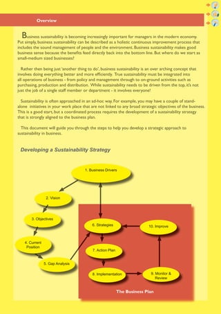 This document provides a 10-step guide for developing a sustainability strategy for small to medium businesses. The steps include: 1) determining business drivers for sustainability; 2) setting a vision and goals; 3) establishing objectives with metrics and dates; 4) assessing the current position; 5) identifying performance gaps; 6) developing strategies to address gaps; 7) creating an action plan; 8) implementing strategies; 9) monitoring progress; and 10) continually improving. An example company, The Big Cheese Company, is used to illustrate how each step can be applied. The 10-step approach provides a framework to integrate sustainability into all business operations.