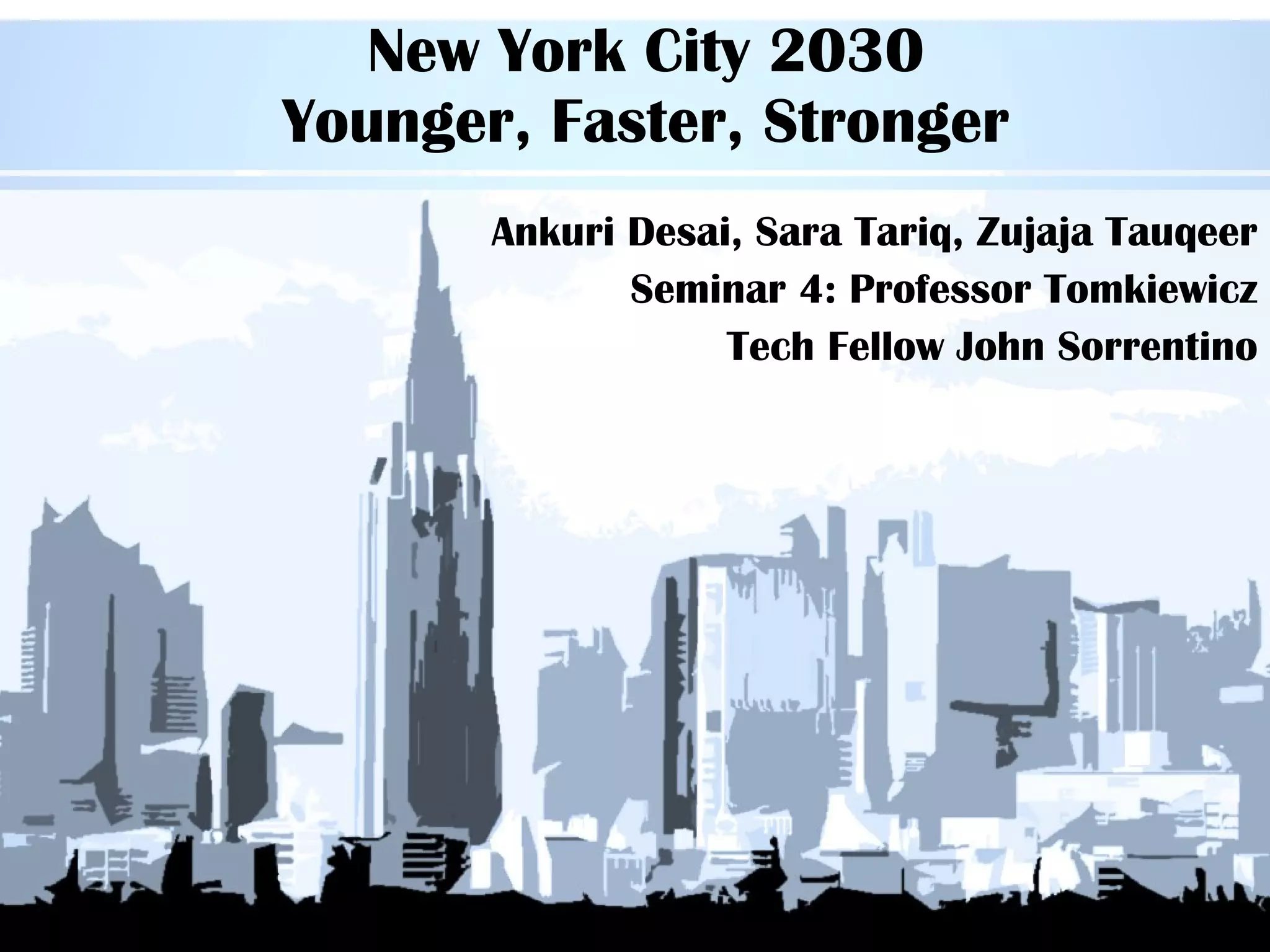 The document presents a vision for New York City in 2030, outlining plans to make the city younger, faster, and stronger through sustainable building practices and resilience efforts. A team of three students - Ankuri Desai, Sara Tariq, and Zujaja Tauqeer - prepared the presentation under Professor Tomkiewicz for their tech fellow John Sorrentino on their research exploring New York City's sustainability and resilience plans through 2030 as outlined on the city's PlaNYC website.