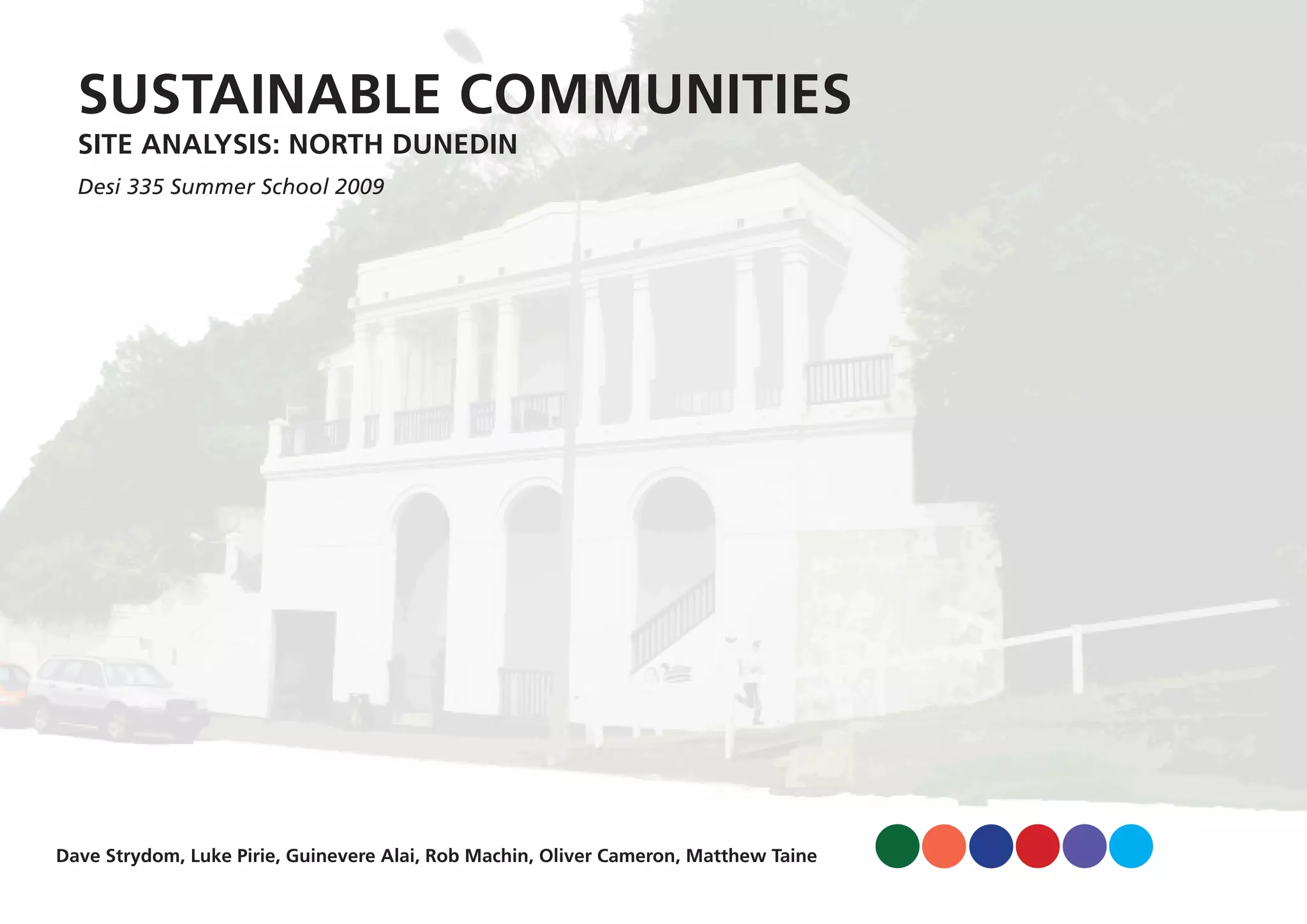 The document provides an analysis of a site located in North Dunedin for a sustainable communities project. It describes the history of the land and existing building, noting it was built in the early 20th century. It outlines the site features, including its north-facing orientation that takes advantage of sunlight, proximity to amenities, and large area of unused land suitable for additional development. The document evaluates the site's potential for a sustainable housing model in North Dunedin.