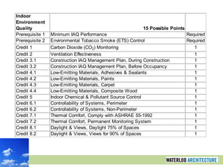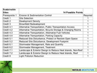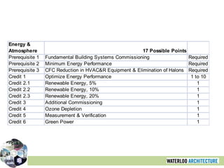 This document provides an overview of sustainable design and the importance of rating systems for assessing green buildings, particularly focusing on the LEED rating system. It outlines various assessment tools and categories within LEED, detailing the criteria for achieving different certification levels. The presentation emphasizes the necessity of quantifying sustainability in building design to facilitate comparisons and enhance marketability.