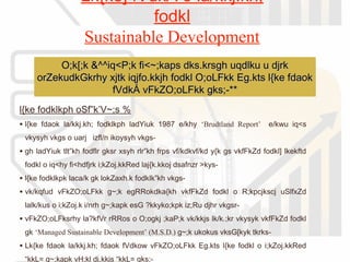 la/kkj.kh; fodkl Sustainable Development O;k[;k &^^iq<P;k fi<~;kaps dks.krsgh uqdlku u djrkO;k[;k &^^iq<P;k fi<~;kaps dks.krsgh uqdlku u djrk orZekudkGkrhy xjtk iqjfo.kkjh fodkl O;oLFkk Eg.kts l{ke fdaokorZekudkGkrhy xjtk iqjfo.kkjh fodkl O;oLFkk Eg.kts l{ke fdaok fVdkÅ vFkZO;oLFkk gks;-**fVdkÅ vFkZO;oLFkk gks;-** l{ke fodklkph oSf”k’V~;s % • l{ke fdaok la/kkj.kh; fodklkph ladYiuk 1987 e/khy ‘Brudtland Report’ e/kwu iq<s vkysyh vkgs o uarj izfl/n ikoysyh vkgs- • gh ladYiuk tlt”kh fodflr gksr xsyh rlr”kh frps vf/kdkvf/kd y{k gs vkfFkZd fodkl] lkekftd fodkl o iq<hy fi<hdfjrk i;kZoj.kkRed laj{k.kkoj dsafnzr >kys- • l{ke fodklkpk laca/k gk lokZaxh.k fodklk”kh vkgs- • vk/kqfud vFkZO;oLFkk g~;k egRRokdka{kh vkfFkZd fodkl o R;kpcjkscj uSlfxZd lalk/kus o i;kZoj.k i/nrh g~;kapk esG ?kkyko;kpk iz;Ru djhr vkgsr- • vFkZO;oLFksrhy la?kfVr rRRos o O;ogkj ;kaP;k vk/kkjs lk/k.;kr vkysyk vkfFkZd fodkl gk ‘Managed Sustainable Development’ (M.S.D.) g~;k ukokus vksG[kyk tkrks- • Lk{ke fdaok la/kkj.kh; fdaok fVdkow vFkZO;oLFkk Eg.kts l{ke fodkl o i;kZoj.kkRed “kkL= g~;kapk vH;kl dj.kkjs “kkL= gks;-