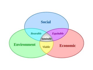 The document discusses the concept of sustainable development including its origins and implications. It begins by defining sustainability and tracing the key historical developments in conceptualizing sustainable development, from the 1972 Stockholm Conference to more recent climate agreements. It then outlines some initiatives in the sustainable development arena and ways of measuring sustainability through indicators. Finally, it discusses the relationship between development and ecology, highlighting perspectives from Hindu traditions that emphasize living in harmony with nature.