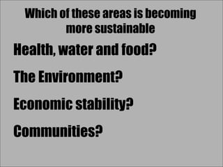 The document discusses a sustainable development model that focuses on improving health, environment, economic stability, and community thriving by analyzing behaviors and their impacts. It emphasizes the importance of limiting our burden on the Earth for future generations and identifies both positive and negative behaviors affecting sustainability. Various organizations and methods are proposed to promote sustainable development through measurable indicators and reasonable objectives.
