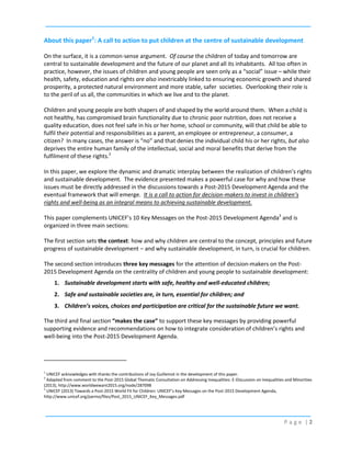 The document emphasizes the integral role of children in sustainable development, asserting that their health, education, and well-being are foundational for future societal progress. It presents three key messages: sustainable development begins with well-nurtured children, safe societies are crucial for child development, and children must be active participants in shaping their future. The call to action urges decision-makers to prioritize children's rights and needs in the post-2015 development agenda to ensure a healthy, equitable world for all generations.