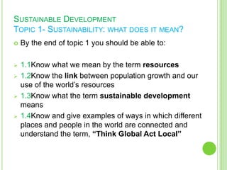 This document provides an introduction to the topic of sustainability. It discusses key concepts like resources, population growth, sustainable development, and interdependence. Resources are defined as anything taken from the environment to make goods and products for human needs and wants. However, using resources leads to waste. Sustainable development means meeting current needs without compromising the ability of future generations to meet their needs. It involves considering consumption, waste, and responsible use of Earth's finite resources. The document stresses thinking globally about how our actions impact others and acting locally through sustainable practices in our own communities.