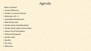 This document discusses gender equality as a principle of sustainable development. It begins by defining gender and explaining that gender is a social construct, as there are natural biological differences but society also creates differences in roles and treatment. It then defines gender equality as equal conditions, treatment, and opportunities for women and men to realize their full potential. The document notes that gender equality is one of the 17 sustainable development goals aimed to be achieved by 2030. It provides data on gender ratios, literacy rates, labor force participation rates, and political participation in India to assess progress and gaps in achieving gender equality. It also discusses benefits of gender equality such as better business and economy, reduced poverty, and better health. The document advocates for more girls' education