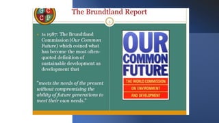 The document discusses the concept of sustainable development and the influential 1987 Brundtland Commission report. It notes that sustainable development meets present needs without compromising future generations' ability to meet their needs. It emphasizes helping the world's poor and respecting environmental limitations. Subsequent UN conferences further developed sustainable development principles. The National Green Tribunal applies sustainable development, precautionary, and polluter pays principles in its decisions. In 2012, the UN set 17 Sustainable Development Goals to address urgent economic, social and environmental challenges.
