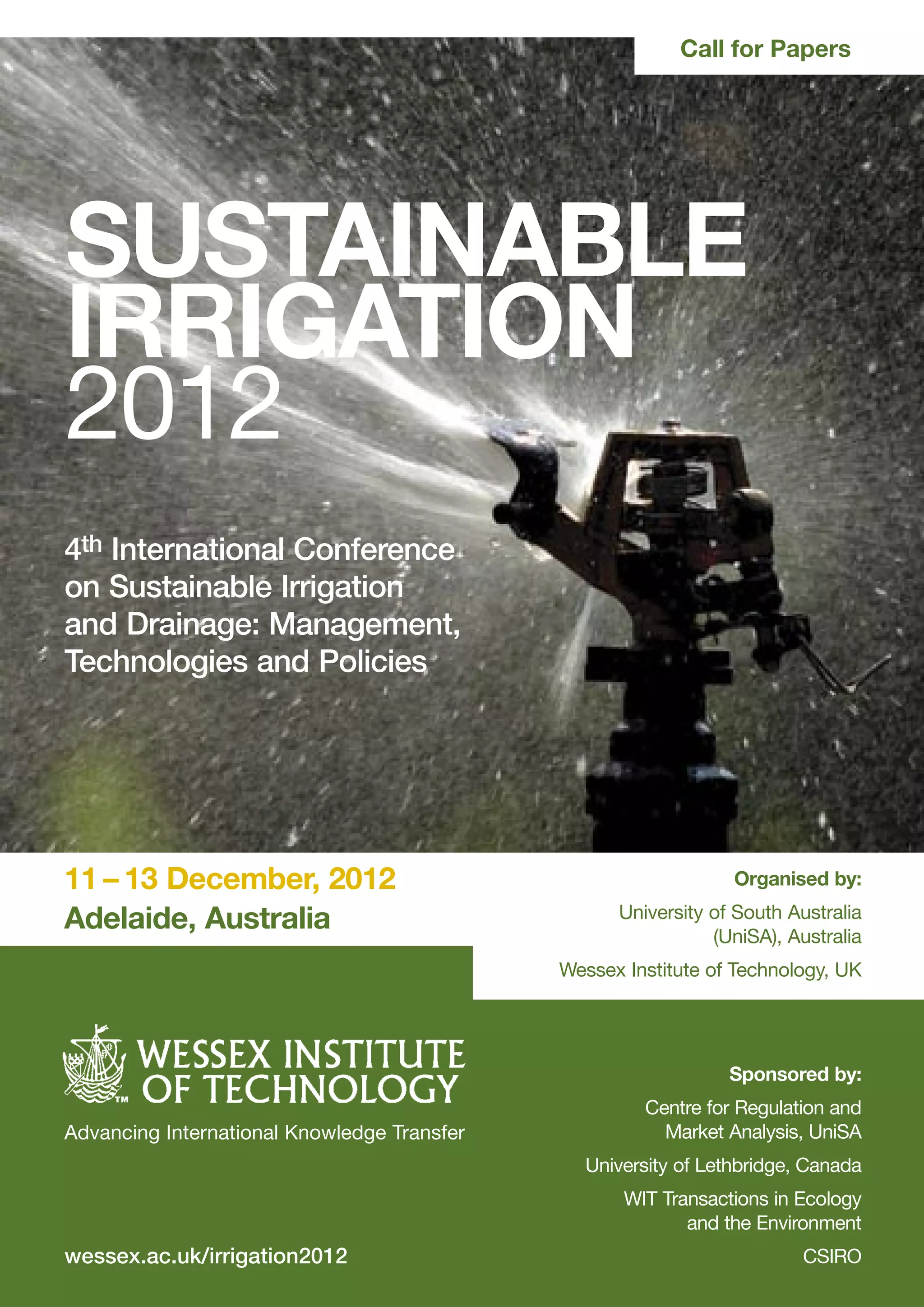 The document announces the 4th International Conference on Sustainable Irrigation and Drainage to be held December 11-13, 2012 in Adelaide, Australia. The conference aims to generate discussion on making irrigation more environmentally, socially, and economically sustainable through multidisciplinary papers. Topics include irrigation management, economics, governance, water quality, and international issues. Authors are invited to submit abstracts of no more than 300 words by the specified deadline.