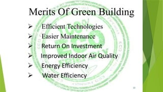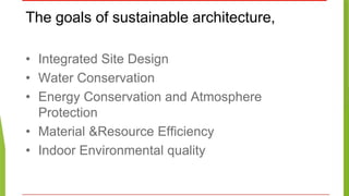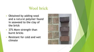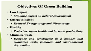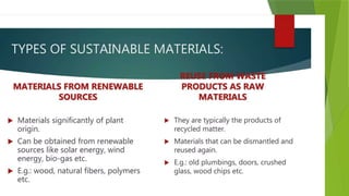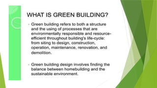 The document discusses sustainable building methods, highlighting straw bale construction and its growing popularity due to affordability and eco-friendliness. It emphasizes the importance of using renewable materials like cork, which enhances air quality and reduces environmental impact. The principles of sustainability in architecture are outlined, focusing on resource economy, life cycle design, and harmony between humans and nature throughout the building process.