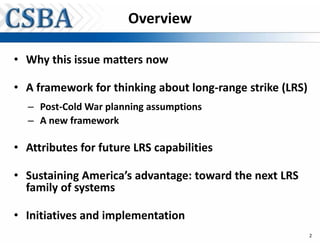 The document discusses the strategic implications and planning considerations for America's long-range strike (LRS) capabilities in a changing global security environment. It emphasizes the urgency of developing a new family of systems to maintain strategic advantage, highlighting the need for advanced capabilities such as standoff and penetrating platforms, improved electronic warfare, and unmanned systems. The analysis critiques past and current planning frameworks while proposing a shift towards a balanced approach integrating both standoff and penetrating strike capabilities.