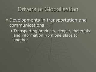The document discusses drivers of globalization such as developments in transportation and communications technology which have made the world smaller and allowed faster transfer of information. It also discusses the impacts of globalization including increased economic competition and standards of living but also social impacts like loss of local culture and environmental impacts like degradation. It then provides a case study of strategies adopted by Singapore to sustain economic development in a globalizing world such as diversifying its economy, nurturing small businesses, expanding its market through economic cooperation, and managing its environment and resources.