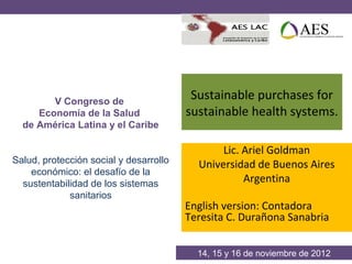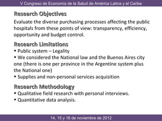 The document discusses the objectives and challenges of purchasing processes in public hospitals in Latin America, focusing on aspects like transparency, efficiency, opportunity, and budget control. It highlights the complexities of achieving ideal purchasing practices due to various deficiencies and emphasizes the need for improved regulatory frameworks and tools such as supplier registries. The document also notes new trends in procurement, including green and electronic purchases.
