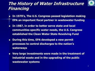 The document discusses the history and importance of sustainable water infrastructure financing in the U.S., highlighting the Clean Water State Revolving Fund and its flexibility for state implementation. It outlines the current challenges in funding to address population growth and aging infrastructure, citing the estimated financial gaps for water investment from 2000 to 2019. The document concludes with the EPA's four pillars for sustainable infrastructure: full cost pricing, water efficiency, better management, and a watershed approach.