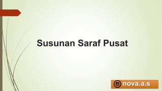 Dokumen ini membahas susunan saraf pusat, termasuk komponen seperti otak dan sumsum tulang belakang, serta berbagai jenis saraf. Selain itu, dijelaskan juga bagian-bagian otak, sistem saraf motorik dan sensorik, serta kerusakan yang dapat terjadi pada neuron motorik. Sumber informasi diambil dari buku karya Pearce Evelyn C tentang anatomi dan fisiologi untuk paramedis.