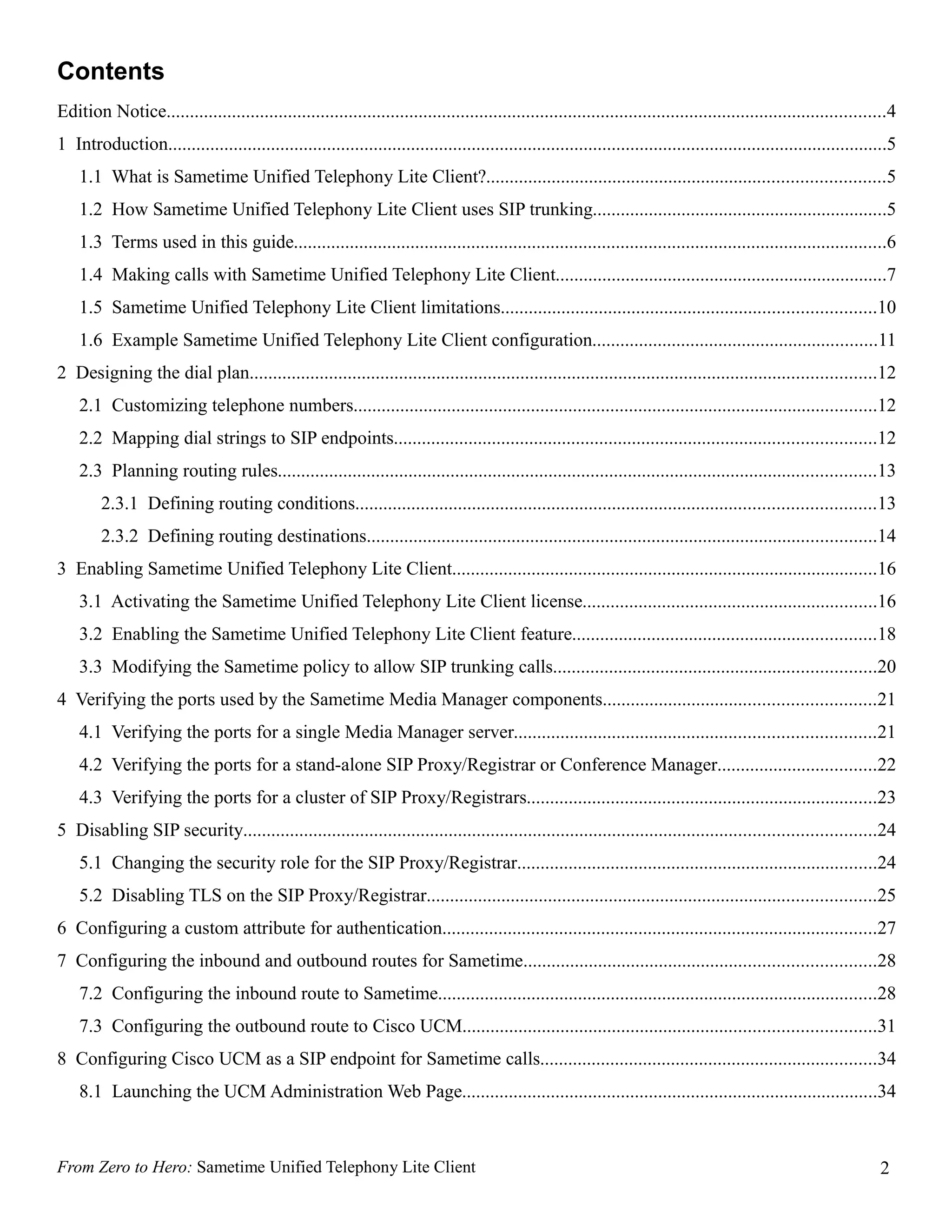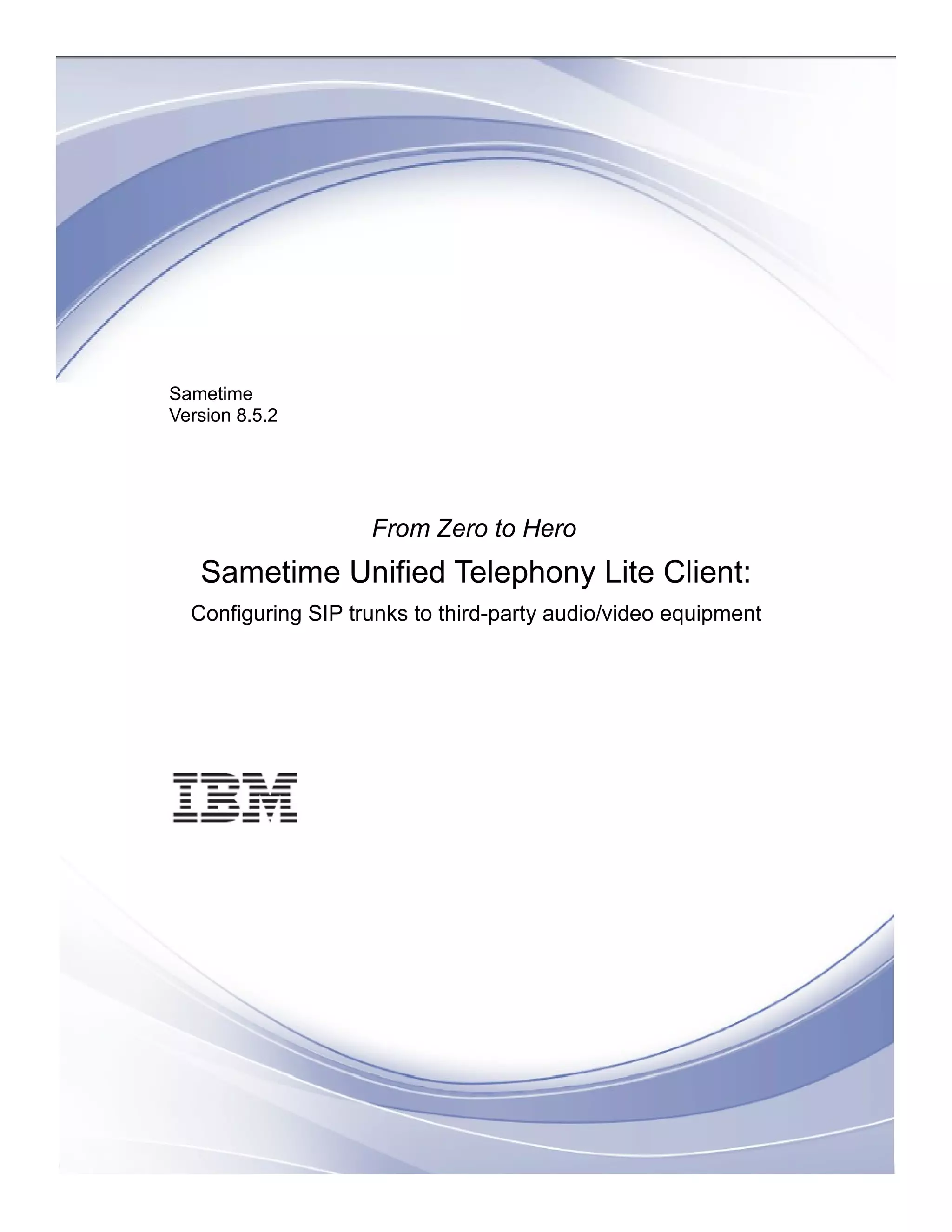 The document is a comprehensive guide for configuring the Sametime Unified Telephony Lite Client version 8.5.2, focusing on setting up SIP trunks with third-party audio/video equipment. It covers the features, limitations, and architectural aspects of the client, including examples of dial plans, routing rules, and integration with Cisco Unified Communications Manager. Key sections include configuring inbound and outbound routes, enabling video calls, and verifying system settings to facilitate efficient telephone and video communication within organizations.