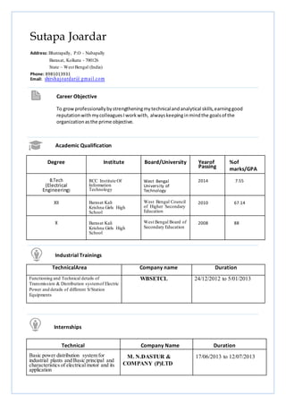 Sutapa Joardar is seeking a job to strengthen her technical and analytical skills. She has a B.Tech in Electrical Engineering from RCC Institute of Information Technology with a 7.55 GPA. She has experience working with WBSETCL and M. N. Dastur & Company and participated in an entrepreneurship program. Her skills include Java, power distribution systems, and she enjoys dancing, cooking, and reading.